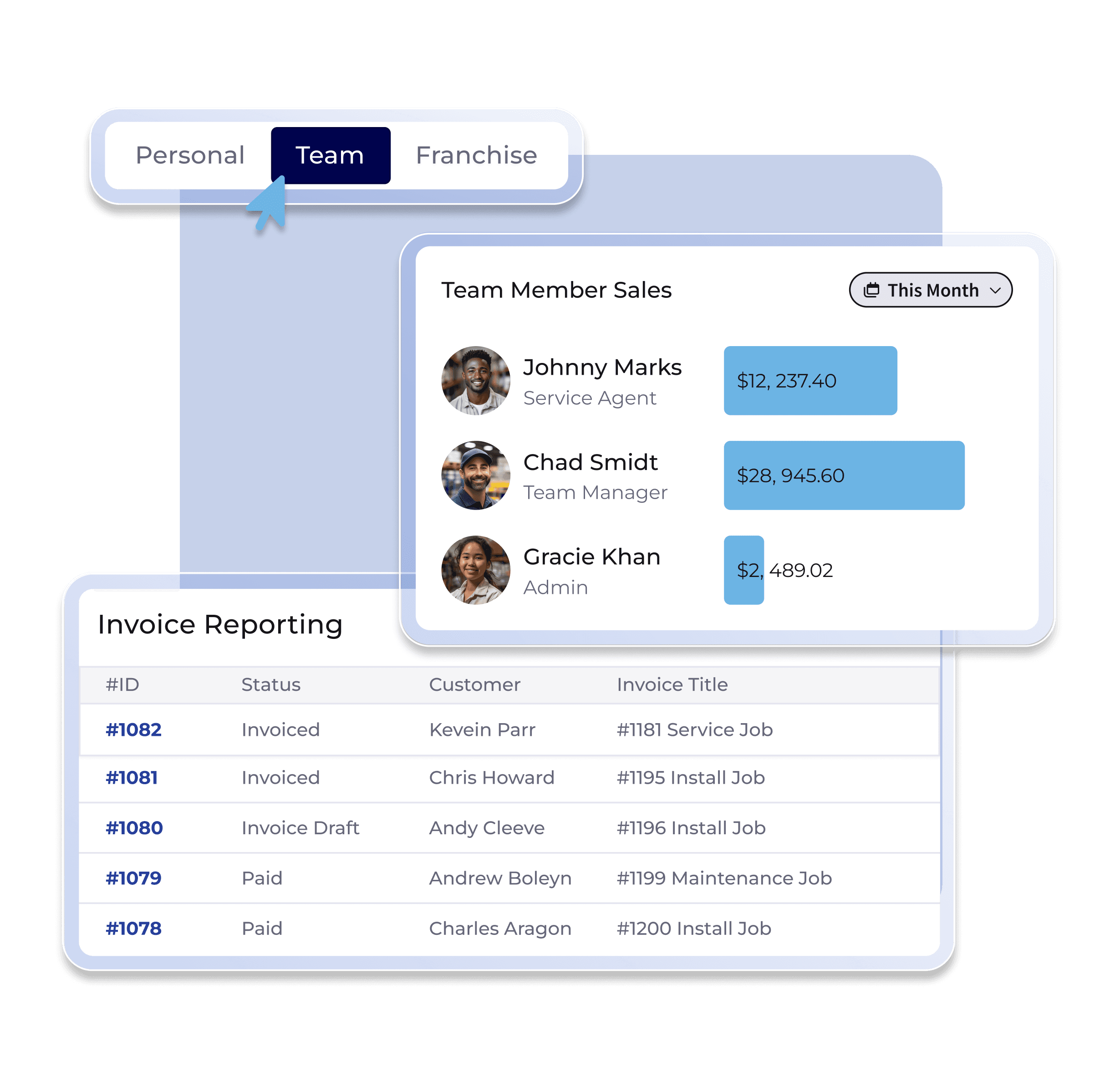 Cross-Department Visibility: See how each department is performing with customizable views for teams, technicians, or specific job types.